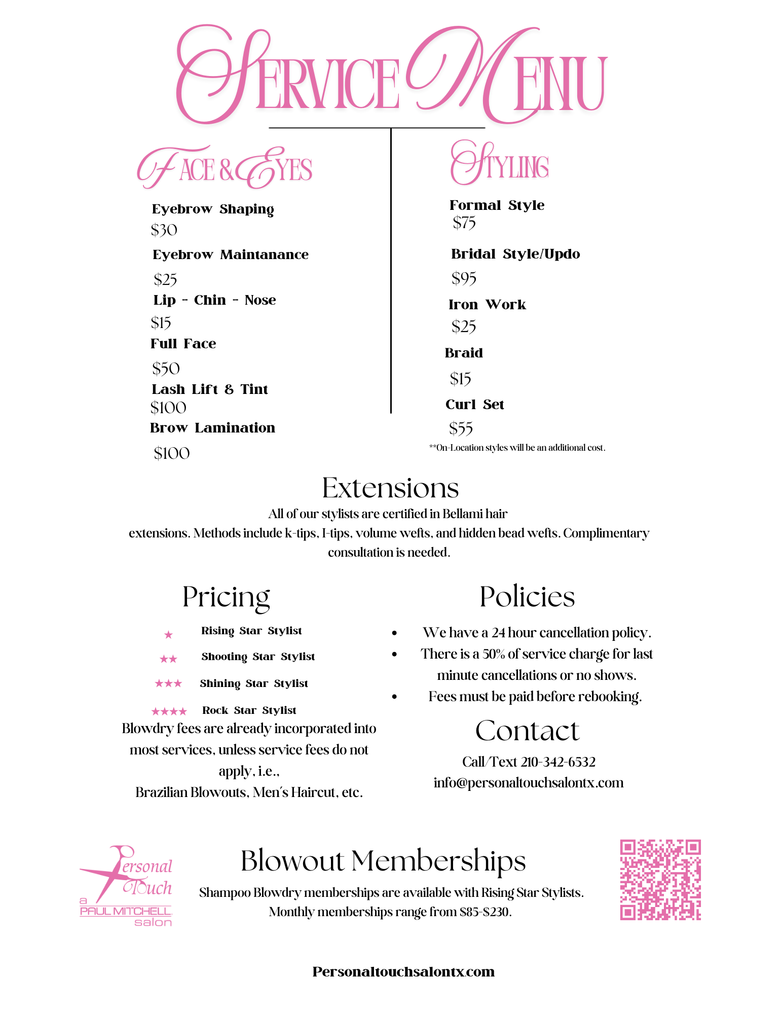 Please note: Personal Touch Salon requires a minimum of 24-hour notice for service cancellation. If you cancel within the 24-hour window, a 50% service fee will automatically be applied.