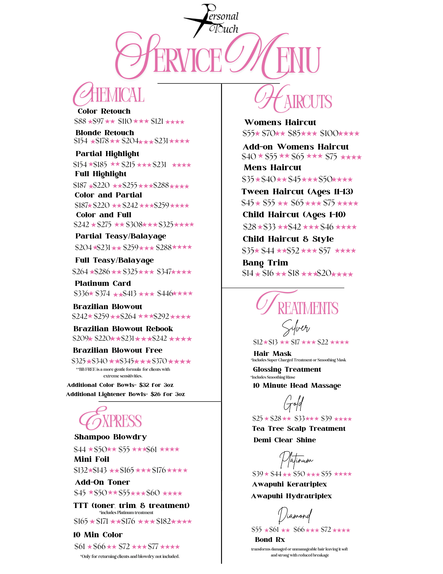 The following salon service menu is effective as of January 5, 2026.